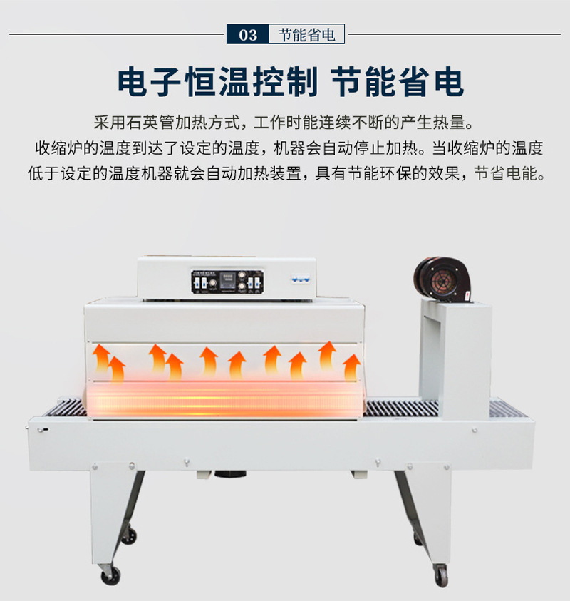 其工作原理是利用加熱元件產(chǎn)生的高溫,讓熱收縮膜受熱后發(fā)生收縮,從而緊密地包裹在產(chǎn)品表面。