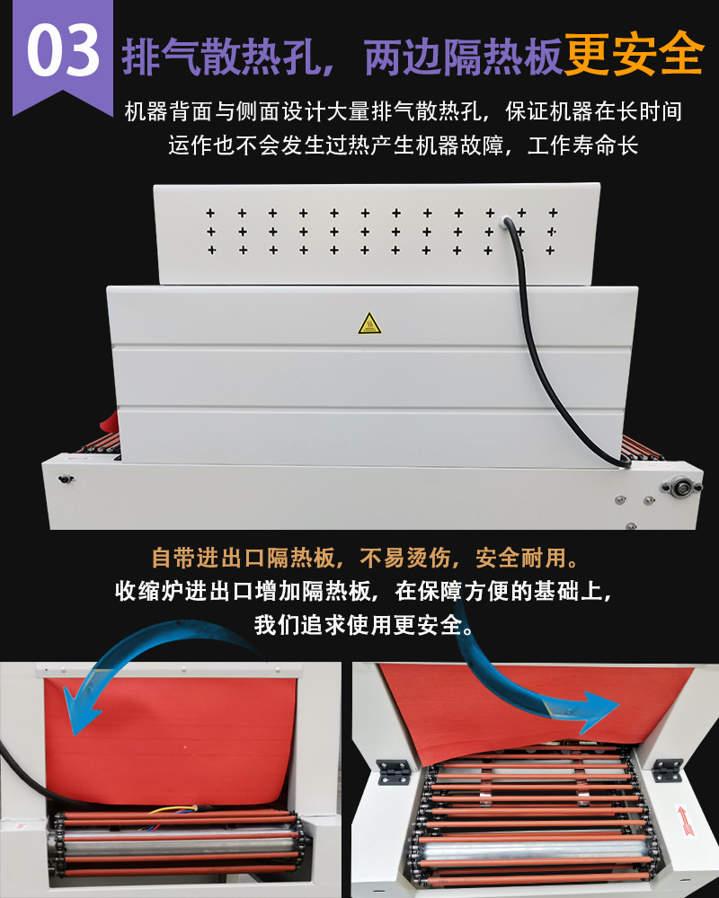 1. 加熱系統:包括加熱元件、溫度控制器等,負責產生熱量并控制加熱溫度,確保收縮膜能夠在合適的溫度下進行收縮。