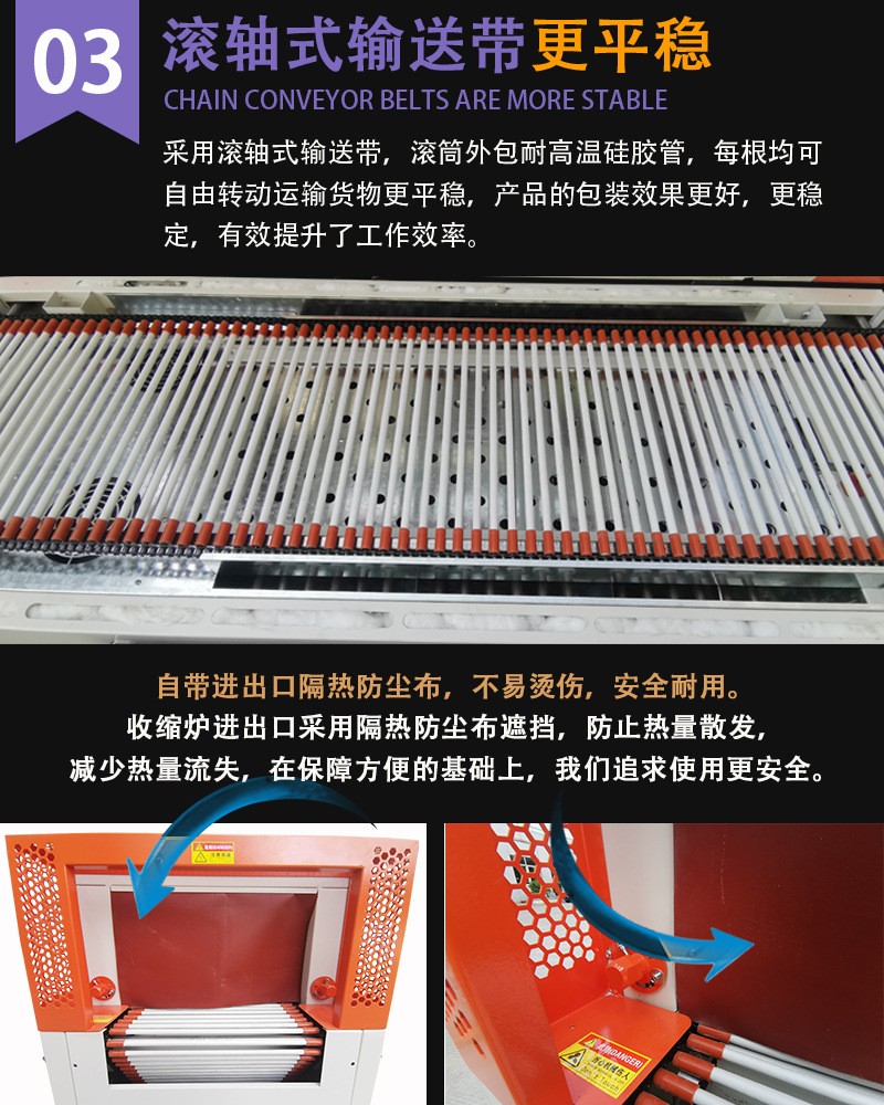 ZB-BSG5030SL熱收縮機(jī)是通過(guò)加熱裝置將熱收縮薄膜加熱至一定溫度,使其軟化并收縮,緊密地包裹在產(chǎn)品表面,從而實(shí)現(xiàn)對(duì)產(chǎn)品的包裝