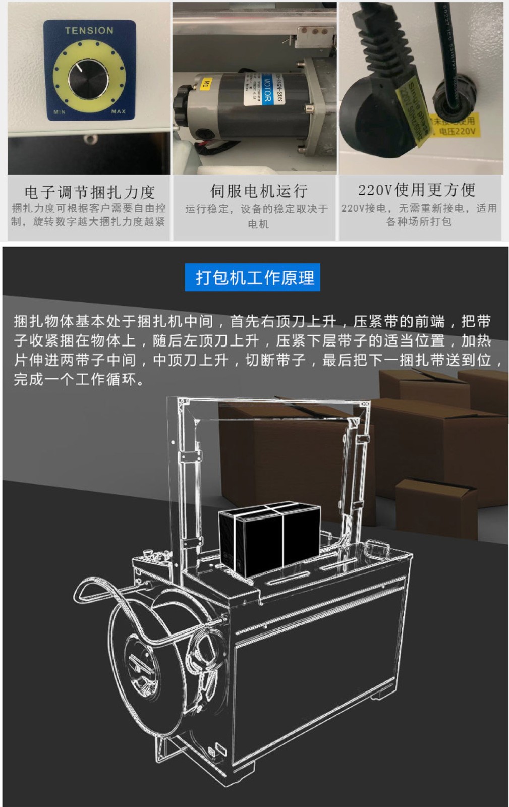 - 適用范圍廣:可以適用于各種不同形狀和尺寸的物品捆扎,如紙箱、木箱、塑料箱等。