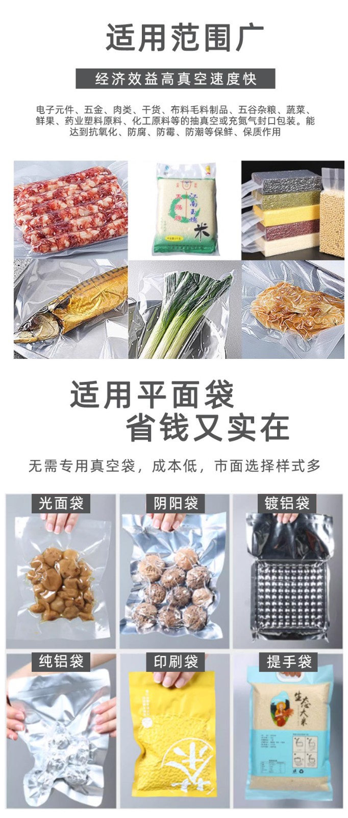 - 食品行業:用于包裝各種食品,如肉類、海鮮、干貨、休閑食品等。例如,在肉類加工廠,可以用它來真空包裝新鮮的肉塊,延長保質期;在干貨生產廠,包裝木耳、香菇等干貨,防止受潮和蟲害。