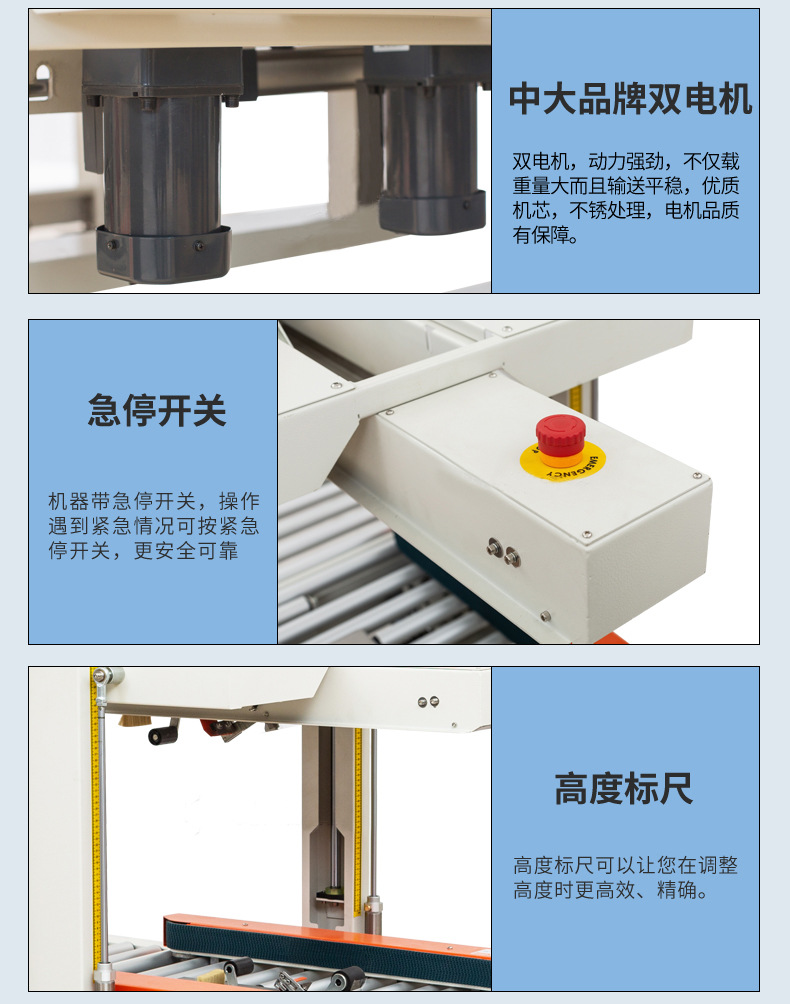 - 準備工作:檢查設備是否完好無損,各部件是否安裝牢固;根據紙箱尺寸和形狀,調整輸送帶寬度、高度以及膠帶寬度、長度和張力等參數;接通電源,啟動設備,等待自檢完成進入待機模式 3。