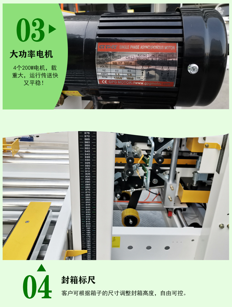- 自動化程度高:具備自動完成紙箱輸送、膠帶粘貼、切割等一系列封箱動作的功能,無需人工進行繁瑣的操作,減少了人工干預,能夠實現連續不間斷的封箱作業,可顯著提高包裝生產效率,滿足大規模生產和快速發貨的需求。