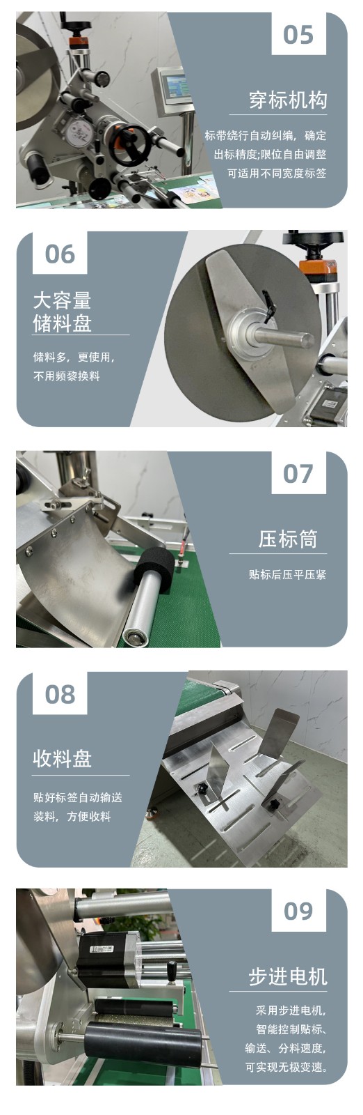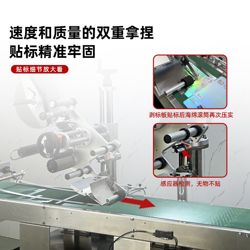 緊接著,分離后的標(biāo)簽或產(chǎn)品快速進入貼標(biāo)環(huán)節(jié)。貼標(biāo)機構(gòu)采用先進的傳感技術(shù)與高精度貼標(biāo)頭,當(dāng)產(chǎn)品通過輸送線到達指定貼標(biāo)位置時,傳感器瞬間捕捉到信號,并即刻將指令傳達至貼標(biāo)頭。貼標(biāo)頭以極快的響應(yīng)速度,將標(biāo)簽從卷狀材料上精準(zhǔn)剝離,隨后以恰到好處的壓力和速度,將標(biāo)簽平整、牢固地貼附在產(chǎn)品表面。整個貼標(biāo)過程一氣呵成,動作流暢且連貫,幾乎沒有絲毫停頓。