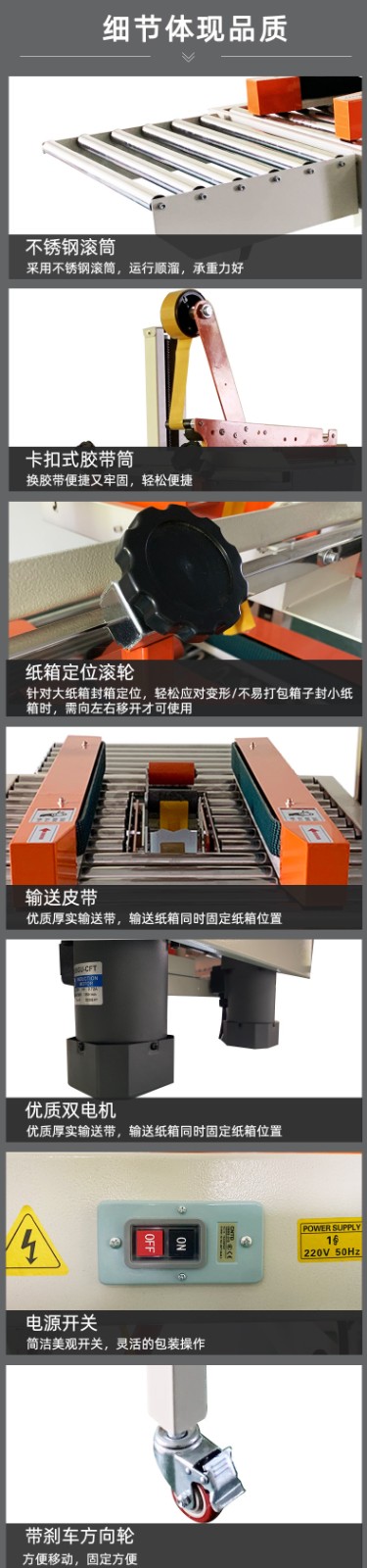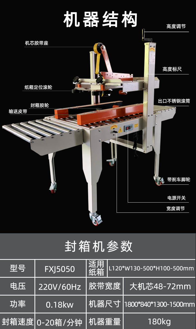 在參數設置方面,操作簡單易懂。工人通過幾個明確標識的按鍵,便能輕松對封箱速度、膠帶長度等關鍵參數進行調整。例如,封箱速度可依據實際生產需求,在操作面板上以遞進式的數字調節方式,從每分鐘 10 箱逐步提升至每分鐘 60 箱不等,以適配不同產量要求的生產線節奏。膠帶長度設置則通過數字輸入框,精確設定每次截取膠帶的長度,確保既不浪費膠帶,又能完全覆蓋紙箱封口。