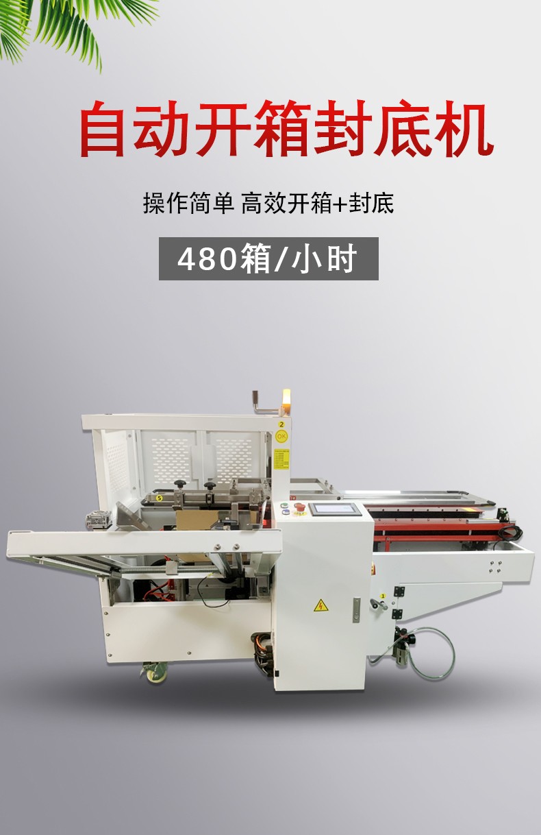 其工作流程高效流暢,利用機械或真空裝置取箱、成型,再通過折疊和粘貼(如膠帶、熱熔膠)等方式完成封底。這一設備大幅減少了人工開箱和封底的工作量,提高了包裝效率,并且可以精準地完成任務,保證紙箱的質量和密封效果。