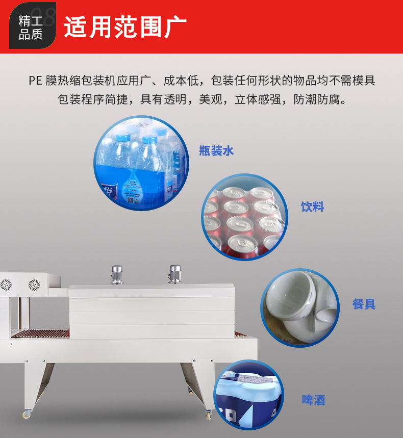 PE 薄膜本身具有良好的柔韌性,再加上 PE 熱收縮機(jī)可以通過調(diào)節(jié)輸送速度、加熱溫度等參數(shù),使得它能夠?qū)Ω鞣N形狀(如圓形、方形、不規(guī)則形狀)和尺寸的產(chǎn)品進(jìn)行包裝。例如,無論是包裝小型的文具,還是大型的工業(yè)零部件,PE 熱收縮機(jī)都能發(fā)揮作用。