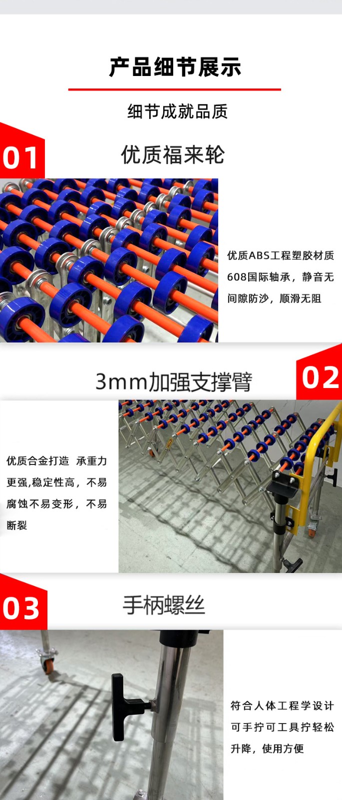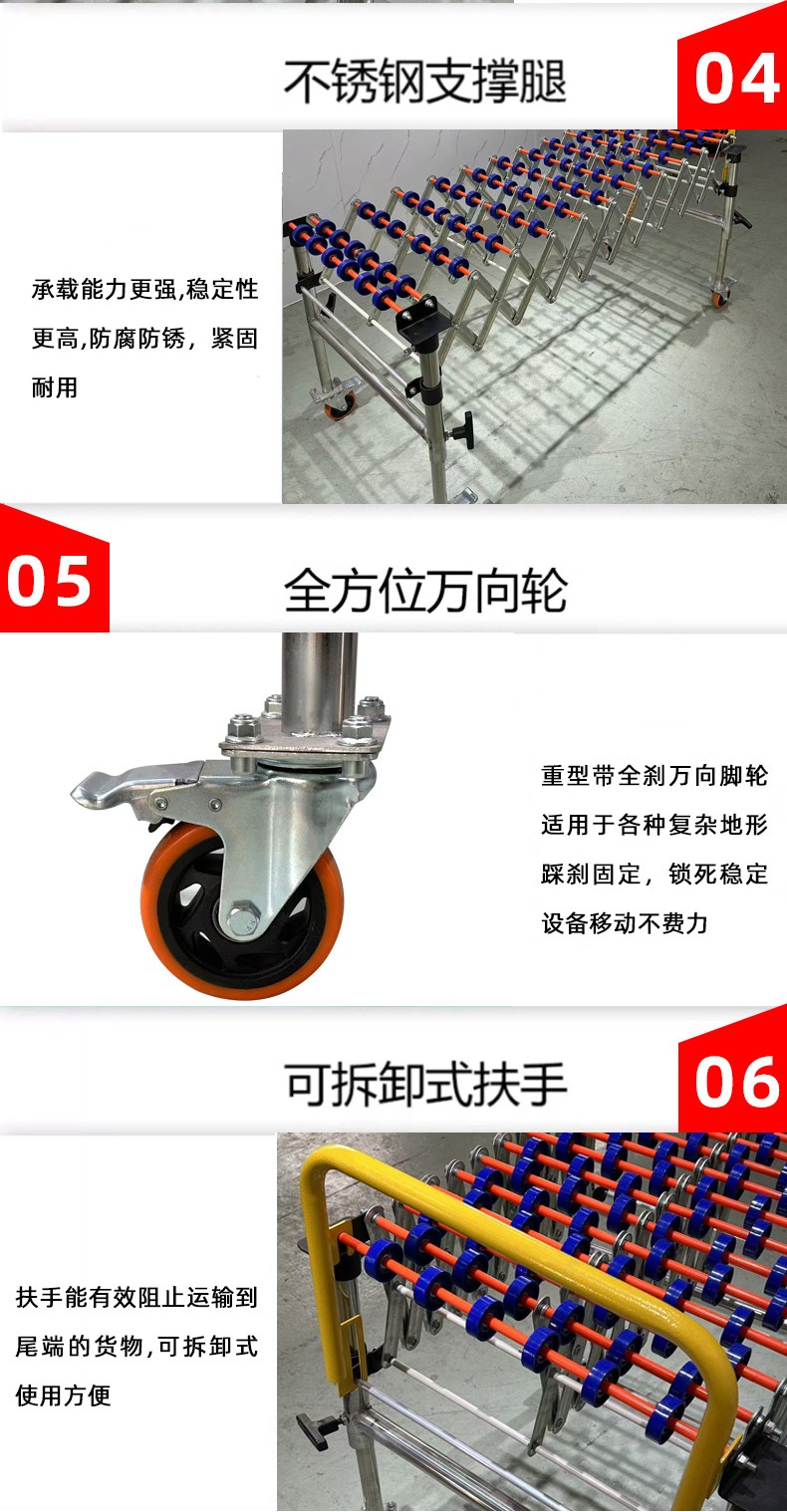 • 通用性強:能夠輸送各種形狀的物體,只要物體底部相對平整,就可以在滾輪上滾動輸送,無論是方形的箱子、圓形的桶還是其他不規(guī)則形狀的物品(在一定范圍內(nèi))。