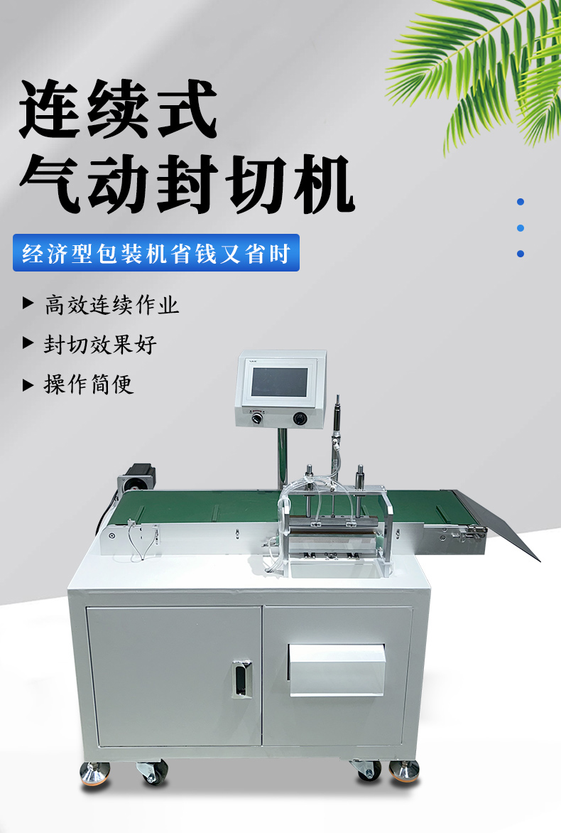連續(xù)式氣動(dòng)封切機(jī)是一種常用于包裝行業(yè)的設(shè)備,它能夠?qū)Ξa(chǎn)品進(jìn)行連續(xù)的封切操作,以下是對其的詳細(xì)介紹: 工作原理 連續(xù)式氣動(dòng)封切機(jī)的工作原理是通過氣動(dòng)系統(tǒng)驅(qū)動(dòng)封切刀,實(shí)現(xiàn)對包裝材料的封口和切斷。具體來說,它通過氣缸的伸縮運(yùn)動(dòng)帶動(dòng)封切刀上下移動(dòng),完成封切動(dòng)作。當(dāng)產(chǎn)品輸送到封切位置時(shí),氣動(dòng)系統(tǒng)會(huì)控制封切刀下降,將包裝材料封口并切斷,然后封切刀上升,等待下一次封切信號(hào)。 結(jié)構(gòu)組成 封切機(jī)構(gòu):主要由封切刀、氣缸、刀架等組成,是實(shí)現(xiàn)封切功能的核心部件。封切刀通常采用合金材質(zhì),具有良好的耐磨性和耐熱性。 輸送機(jī)構(gòu):由輸送