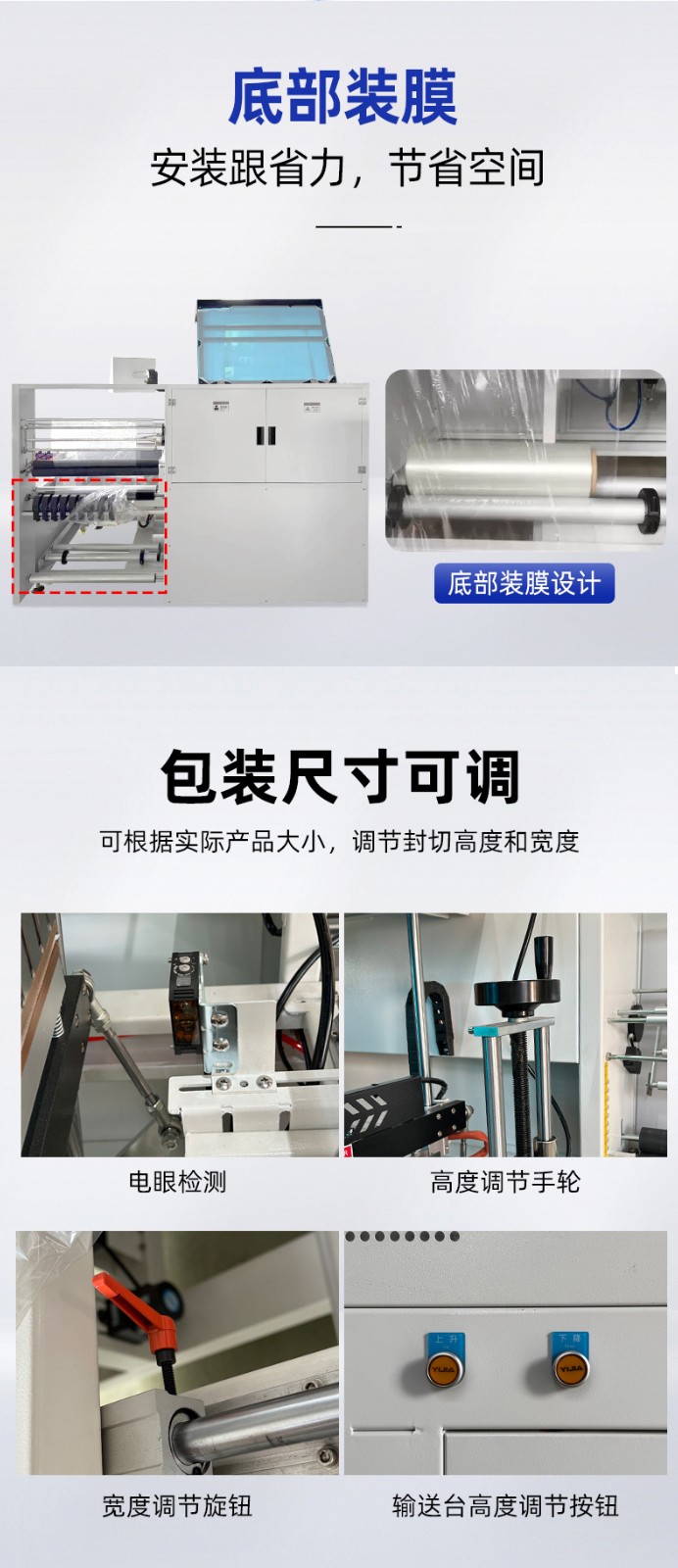 效率更高- 全自動流程:無需人工干預封切、送膜、收縮,單機產能可達 15-60 件 / 分鐘(根據產品尺寸調整),遠超半自動機型;