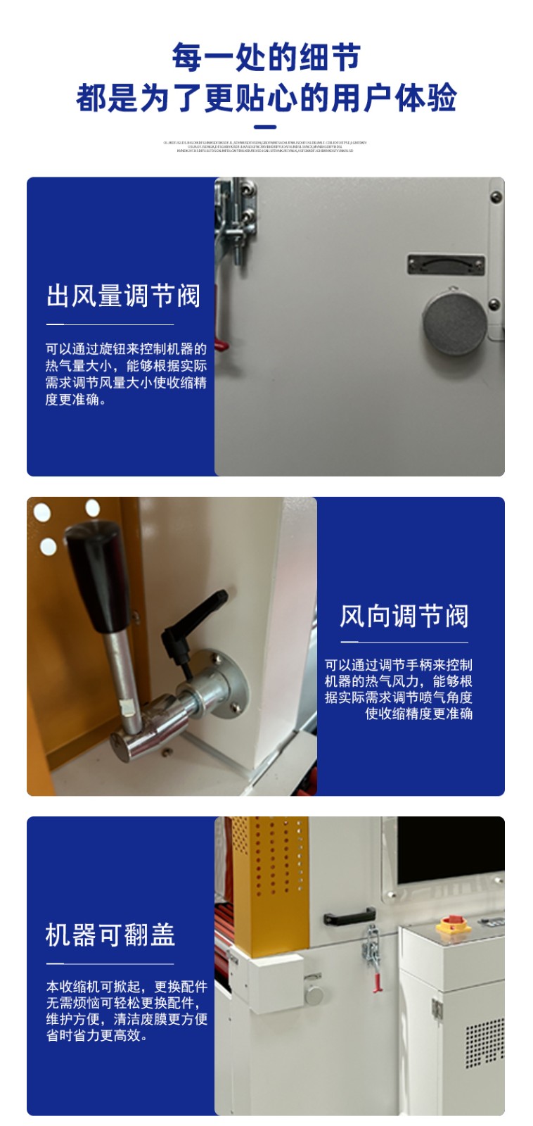 - 收縮均勻:熱風循環系統確保通道內溫度無死角,膜材收縮后無氣泡、無褶皺,外觀規整(尤其適合醫藥、美妝等對包裝顏值要求高的行業)。