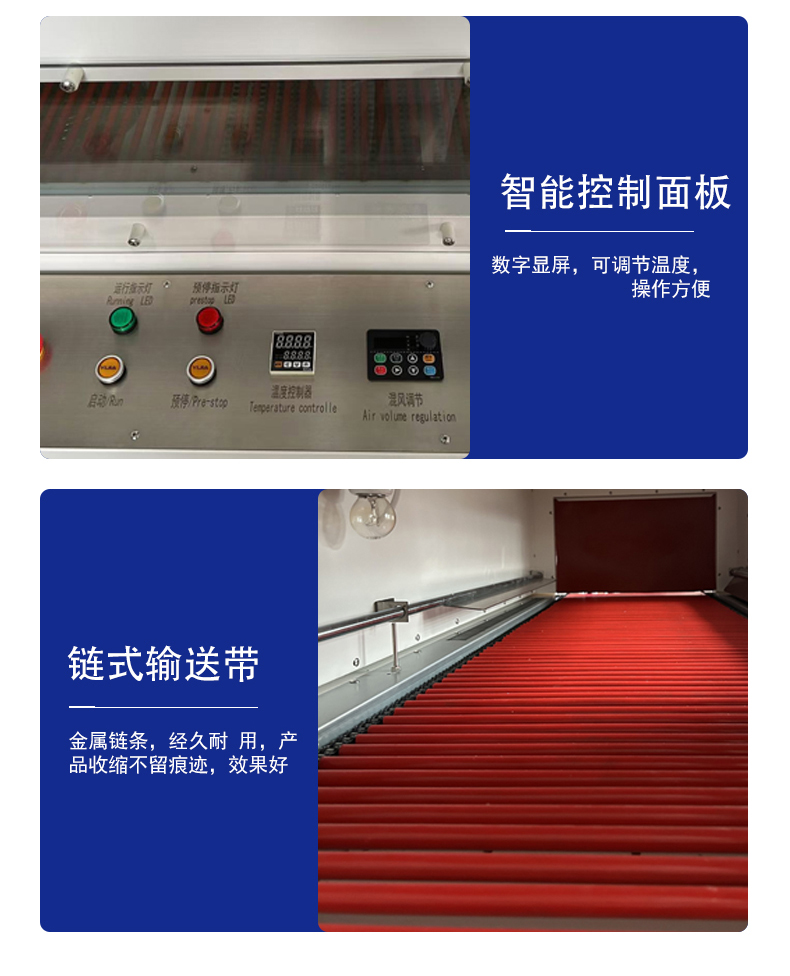 封切后的 “膜 + 產品” 進入通道,內部通過熱風循環系統(多組發熱管 + 離心風機)產生均勻熱風,使膜材受熱收縮并緊密貼合產品表面;通道溫度、風速、輸送速度可精準調節,適配不同材質的膜(如 POF 膜需 120-180℃,PE 膜需 180-220℃)。
