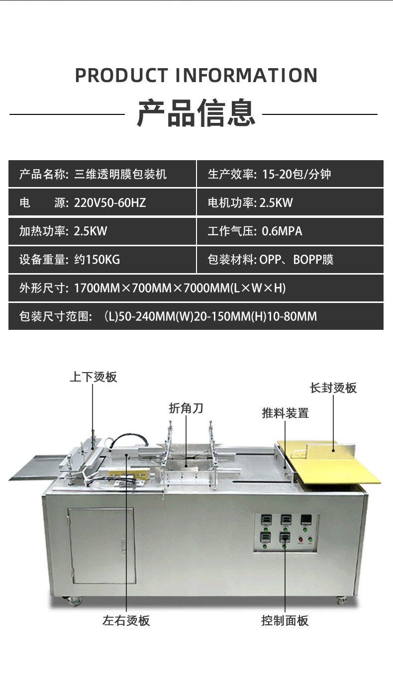 設備通過 “膜料預處理→人工上料定位→三維裹膜成型→熱封切邊→折邊定型→成品輸出” 的流程,實現產品的立體包裝,具體步驟拆解如下: