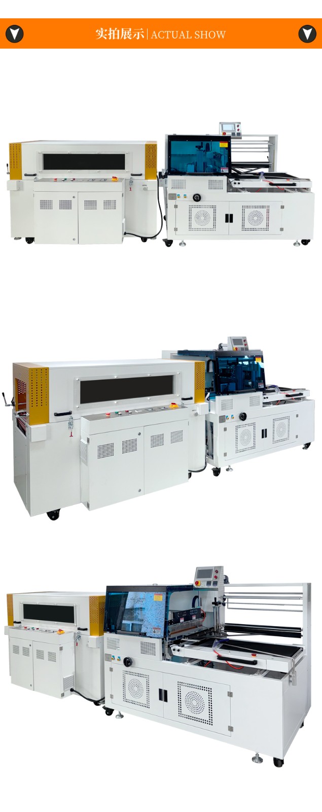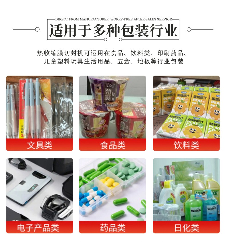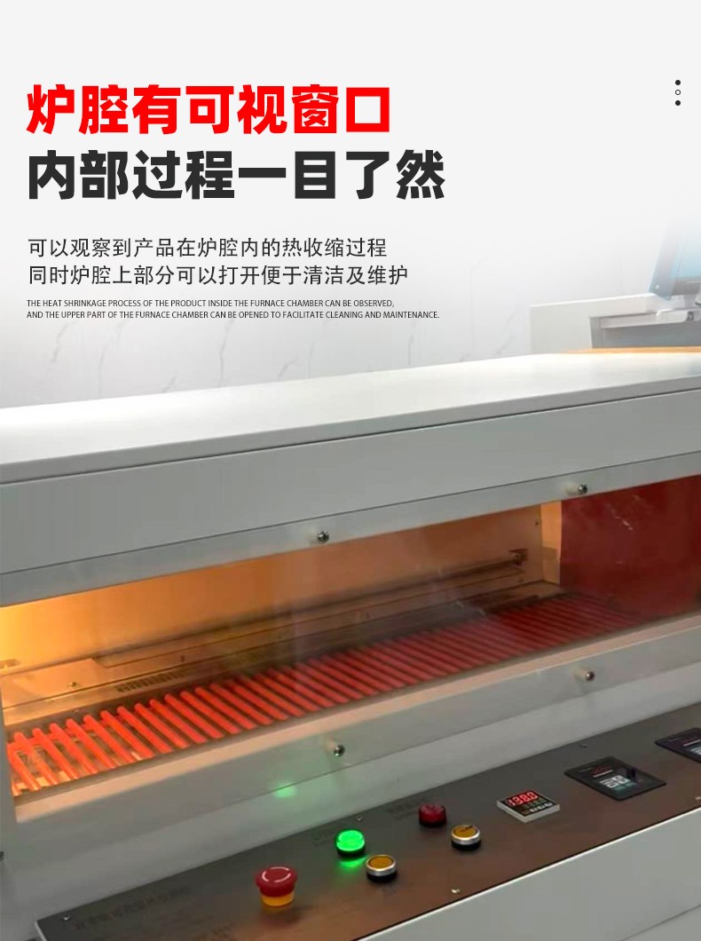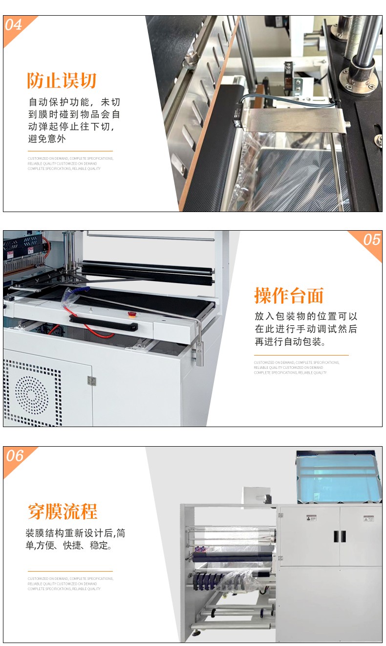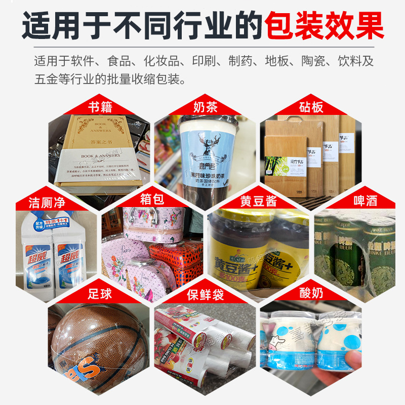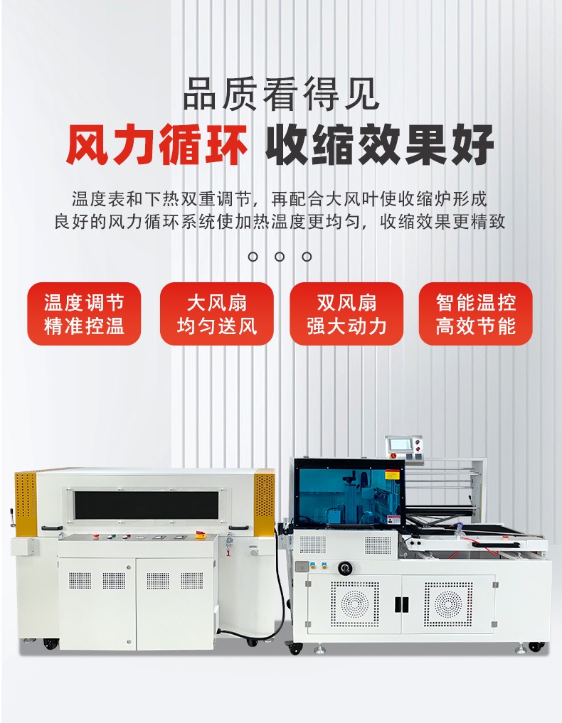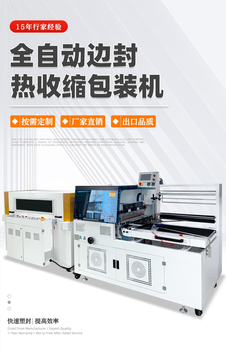 利用薄膜輸送系統(tǒng)將包裝薄膜圍繞產(chǎn)品,然后通過邊封裝置對薄膜的側(cè)邊進行密封,形成一個包裹產(chǎn)品的袋子。之后,產(chǎn)品被輸送到熱收縮通道,熱空氣使薄膜收縮并緊緊貼合在產(chǎn)品表面,完成包裝。