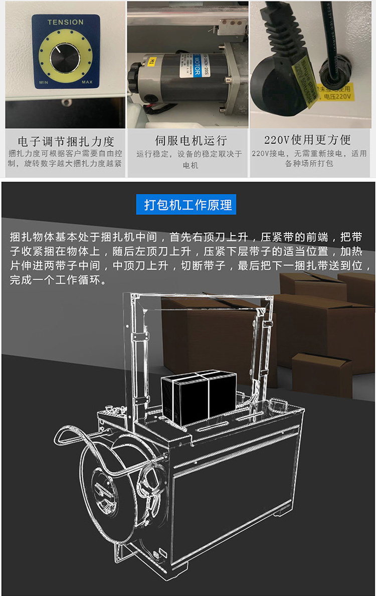 MH-301A全自動免扣式打包機電商快遞專用pp帶紙箱捆扎配套封箱機