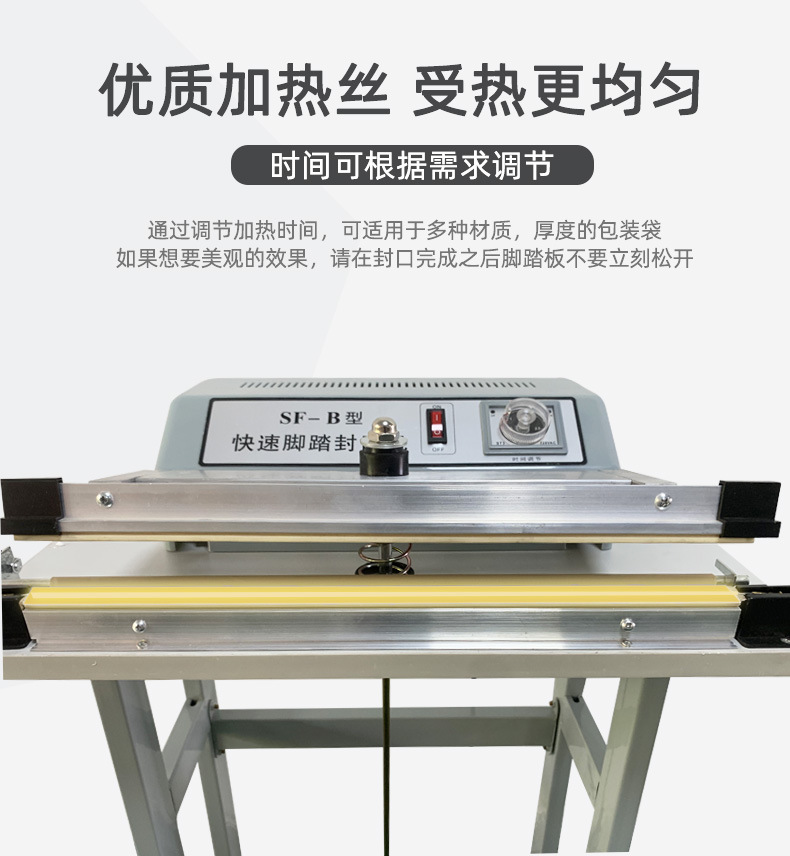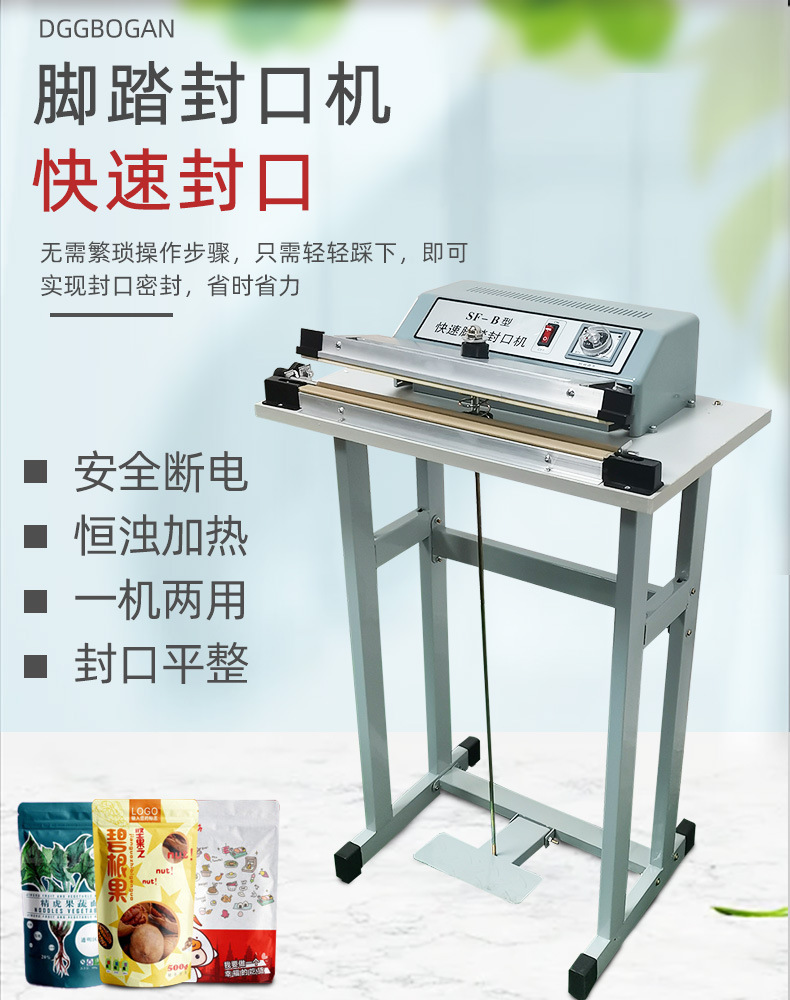 腳踏封口機適用于各種塑料薄膜、?復合薄膜及鋁塑薄膜的封合。?這種封口機因其高效、?簡單操作和廣泛的應用領域,?被廣泛應用于食品、?醫藥、?五金等多個行業。?具體來說,?腳踏封口機的應用特點包括:?