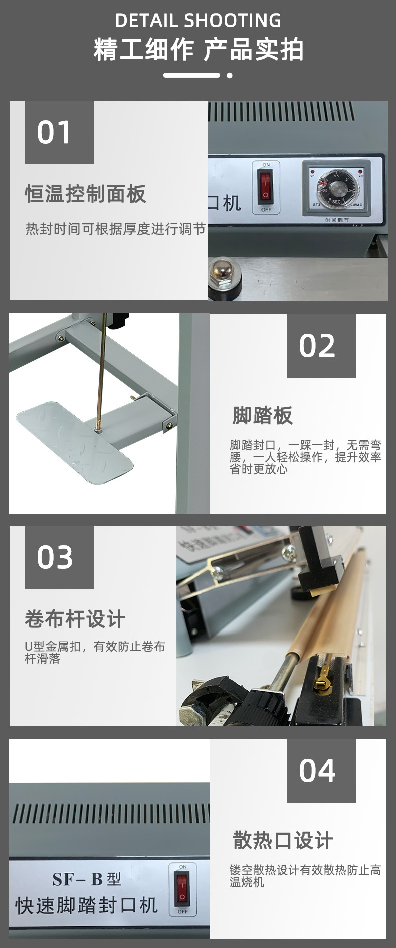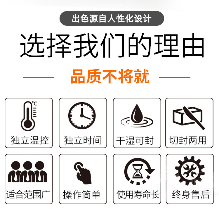 - 操作簡便:?操作簡單,?加熱時間可調,?接通電源即可工作,?適用于各種塑料薄膜封口。?
